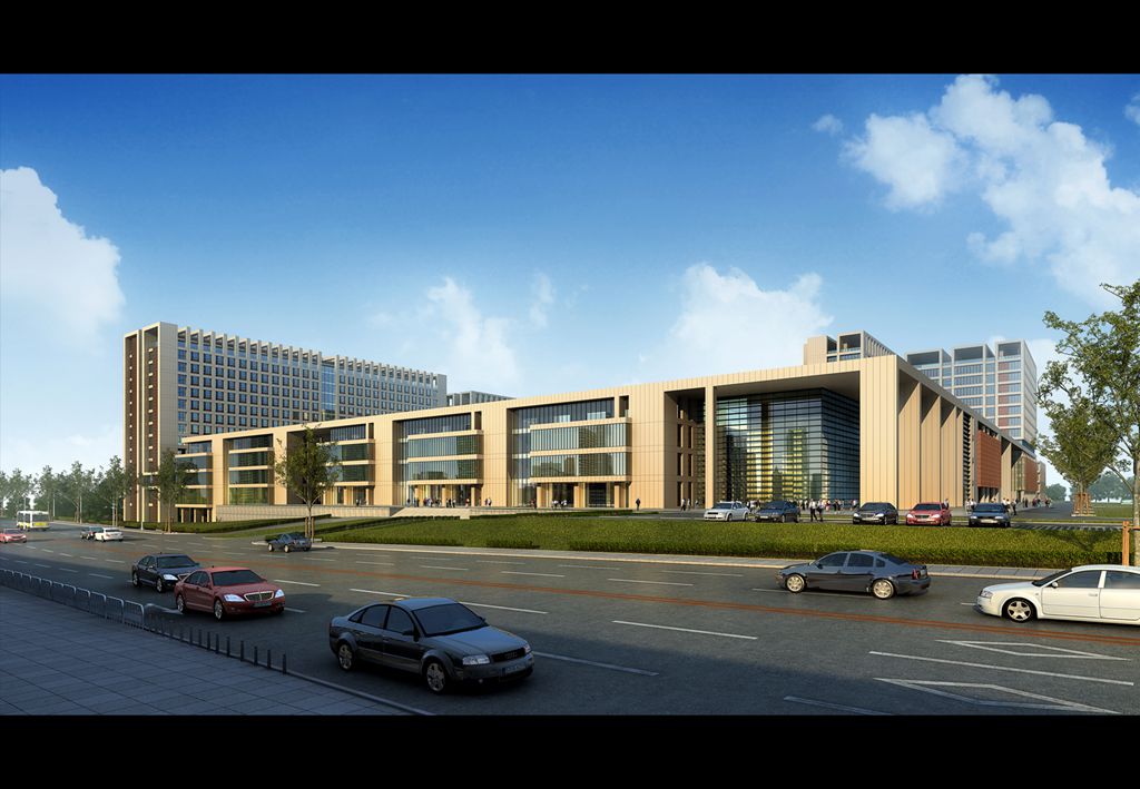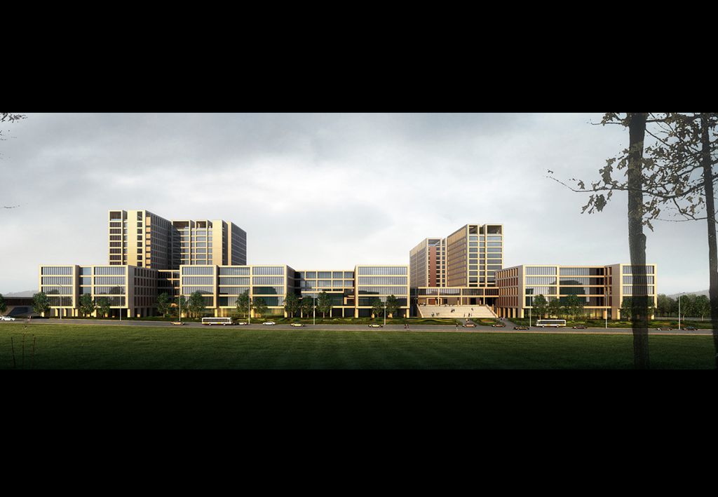 该项目为一个新建综合医院,一期设计为800床,远期为1500床。用地是一片洼地,极其不平整,后期建设工程中,土方量很大,结合用地特点和后期土方量费用的节省,我们将中间地块考虑成中央花园,为病人提供一个休息的场所,各个医疗功能区布置在医疗地块的四周,通过环形的医疗街将其串联,寓意“医疗花园·生命之环”。
