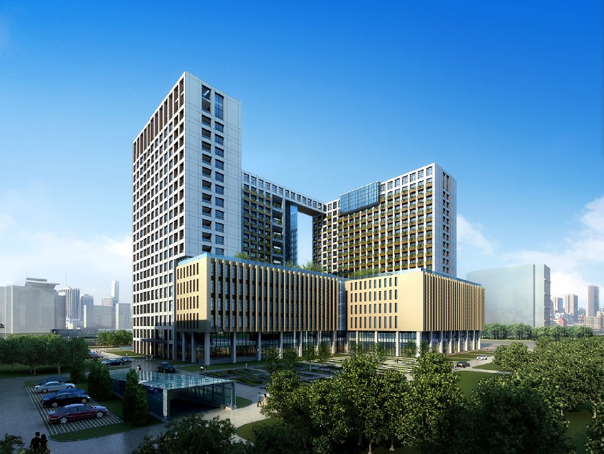 通过对院区内建筑情况的分析,我们将病房楼设计两栋楼,分为普通病房楼和军人病房楼,更利于管理,同时也化整为零,将巨大的建筑体型分解,减小对周边环境的压迫。建筑采用规则矩形,与中轴线曲线形建筑相互衬托,更加突出中轴的标志性地位。入口的船型建筑群和中心的太极形建筑群组成院区的中心轴线,富有标志性,新住院二部应为中轴线提供一个背景,更加衬托出中轴线建筑的标志性。