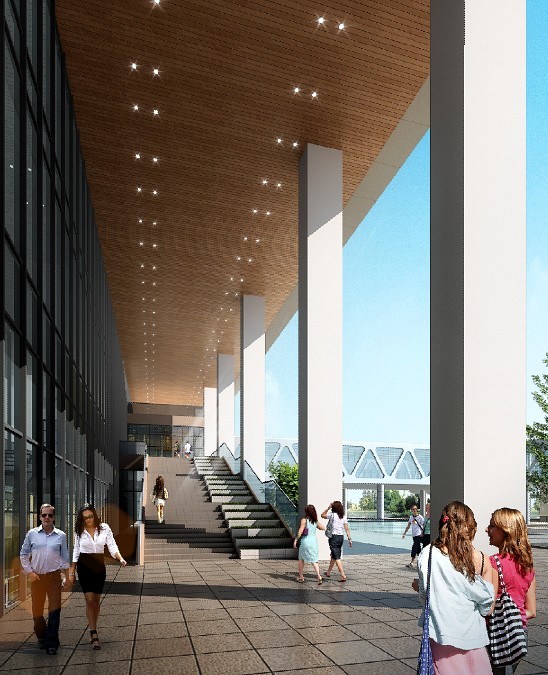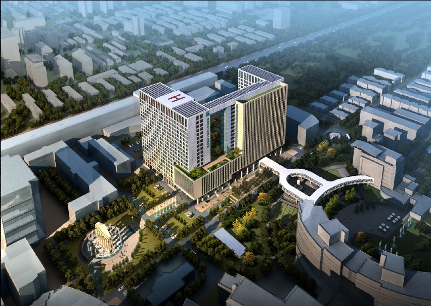 通过对院区内建筑情况的分析,我们将病房楼设计两栋楼,分为普通病房楼和军人病房楼,更利于管理,同时也化整为零,将巨大的建筑体型分解,减小对周边环境的压迫。建筑采用规则矩形,与中轴线曲线形建筑相互衬托,更加突出中轴的标志性地位。入口的船型建筑群和中心的太极形建筑群组成院区的中心轴线,富有标志性,新住院二部应为中轴线提供一个背景,更加衬托出中轴线建筑的标志性。