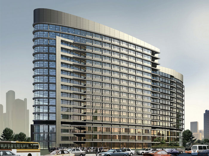 用地分为东西两个地块,东地块医疗区建设内容包括门诊医技楼、病房楼及餐厅等建筑物;西地块后勤区建设内容包括办公、教学、科研和住宅区、专家公寓及学生宿舍等。本案巧妙利用建筑布局和空间构成解决不规则夹角关系。外观效果新颖独特,个性鲜明。
