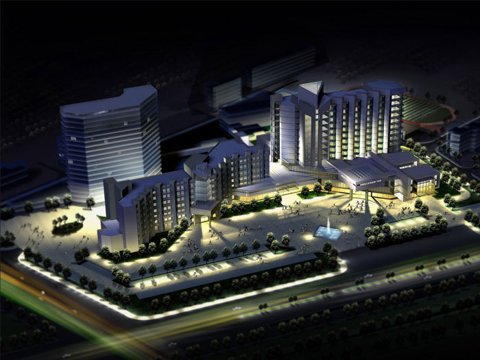 基地内原有一座7层折线型的病房楼,综合楼设计中充分考虑这个条件,力图融合现状,整合空间,综合楼主楼与原病房楼取齐,门诊部分抹45度角,布局在南侧裙房,新、老建筑组合成一个建筑群,并界定了共同的院前广场。